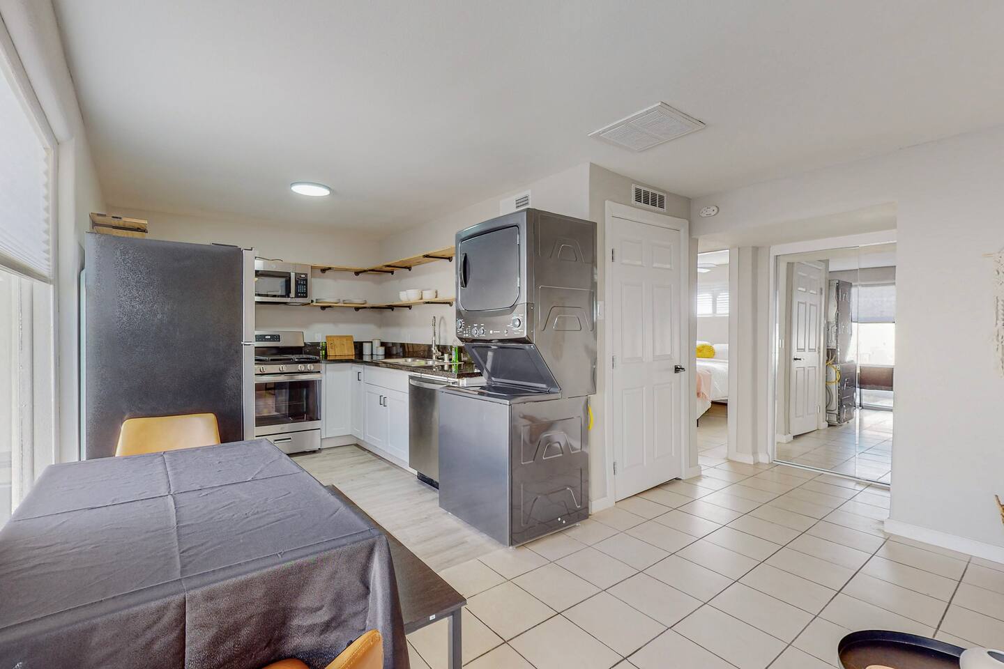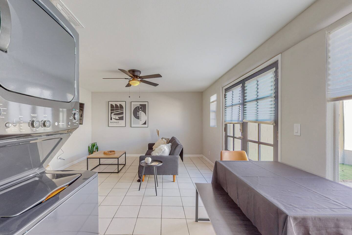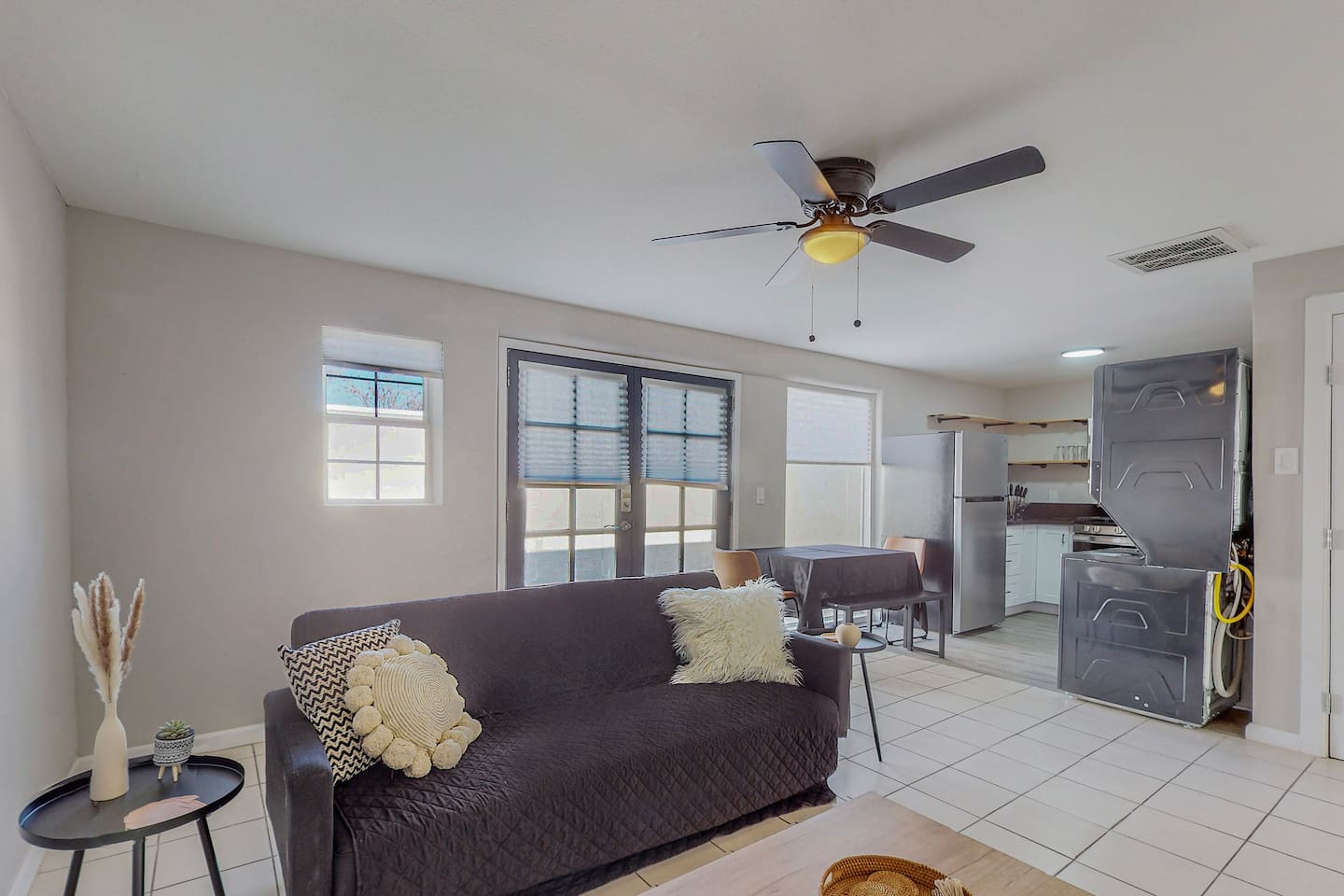 Newly Remolded Apartment with Private Courtyards Fully Furnished We are dog-friendly Onsite Dog Run and Bath Located near UNM, UNMH, and Presbyterian Hospital Walking distance from the best Breweries and Restaurants in Albuquerque Smart TV, Disney+, HULU, NETFLIX, HBO, Amazon Prime, And Local Channels Common yard w/ fire pit and grills FAST Wifi Master bedroom with ensuite bathroom Tempur-Pedic bed Fully equipped kitchen w/ granite countertops Extremely safe neighborhood FREE Onsite secured parking Washer + Dryer in unit