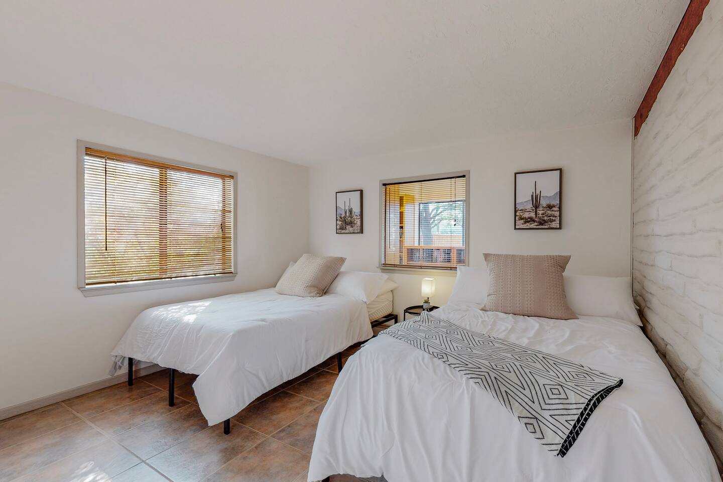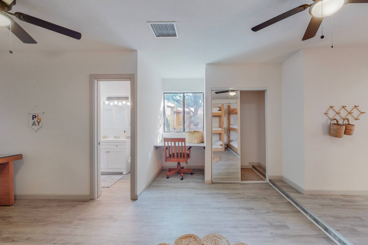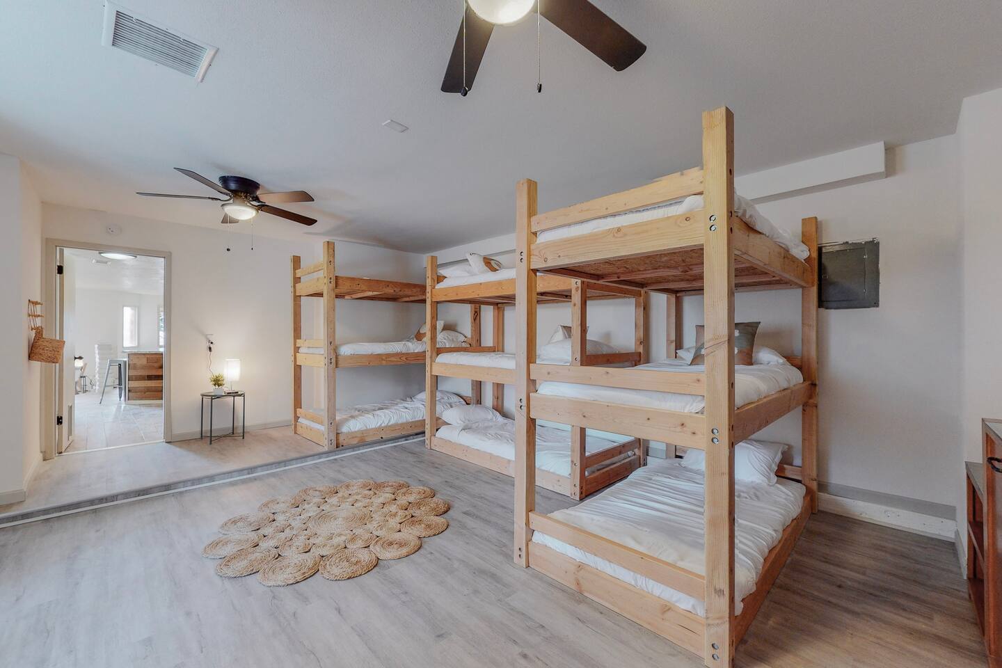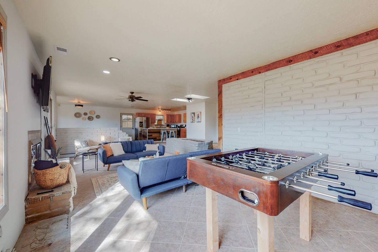 This spacious rental is ideal for families or groups visiting Albuquerque! • Located off Route 66 in the Four Hills neighborhood • Private backyard with a hot tub, fire pit, and outdoor games • Indoor heated pool and sauna for ultimate relaxation • 3400 sq ft home with 4 beds, 4 baths, and an oversized kids' room with large bunk beds • Fully equipped outdoor kitchen • Foosball table, fast WiFi, and endless entertainment options